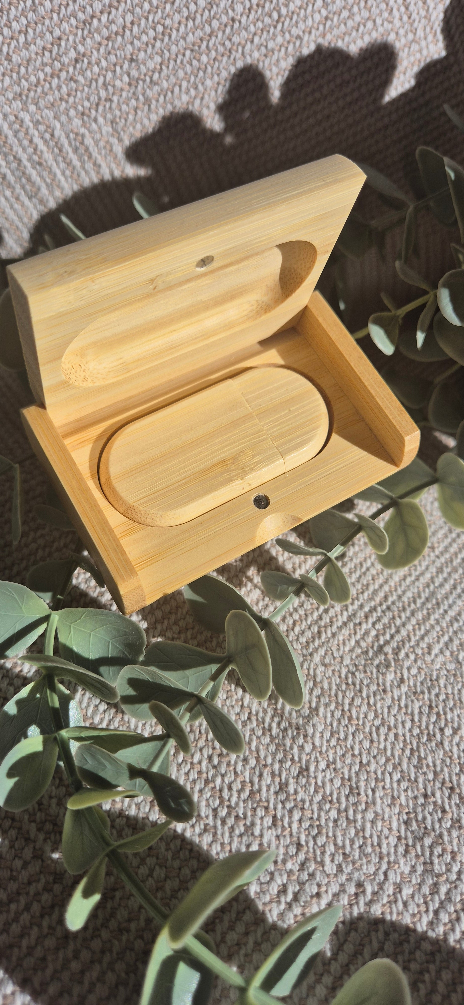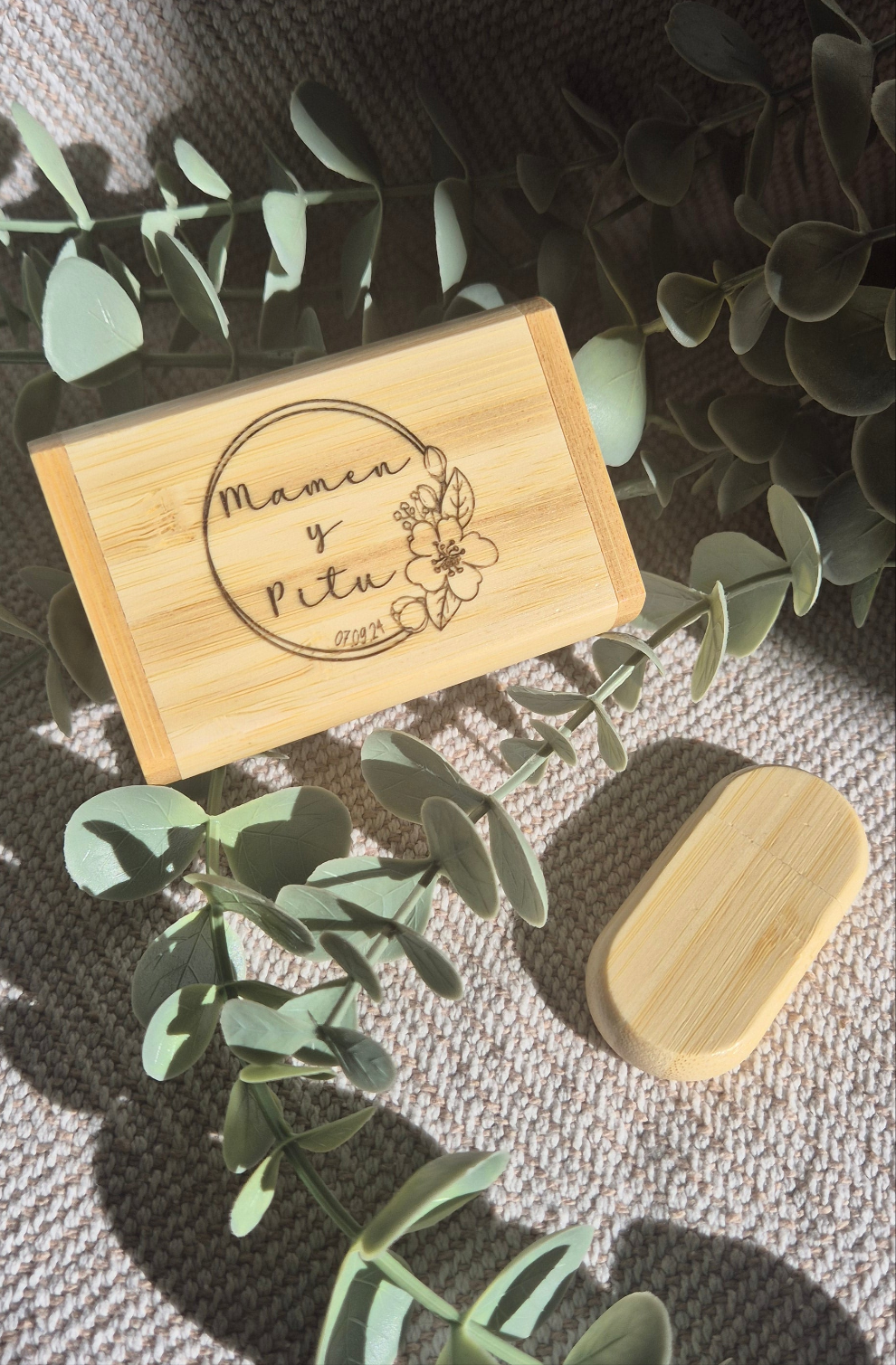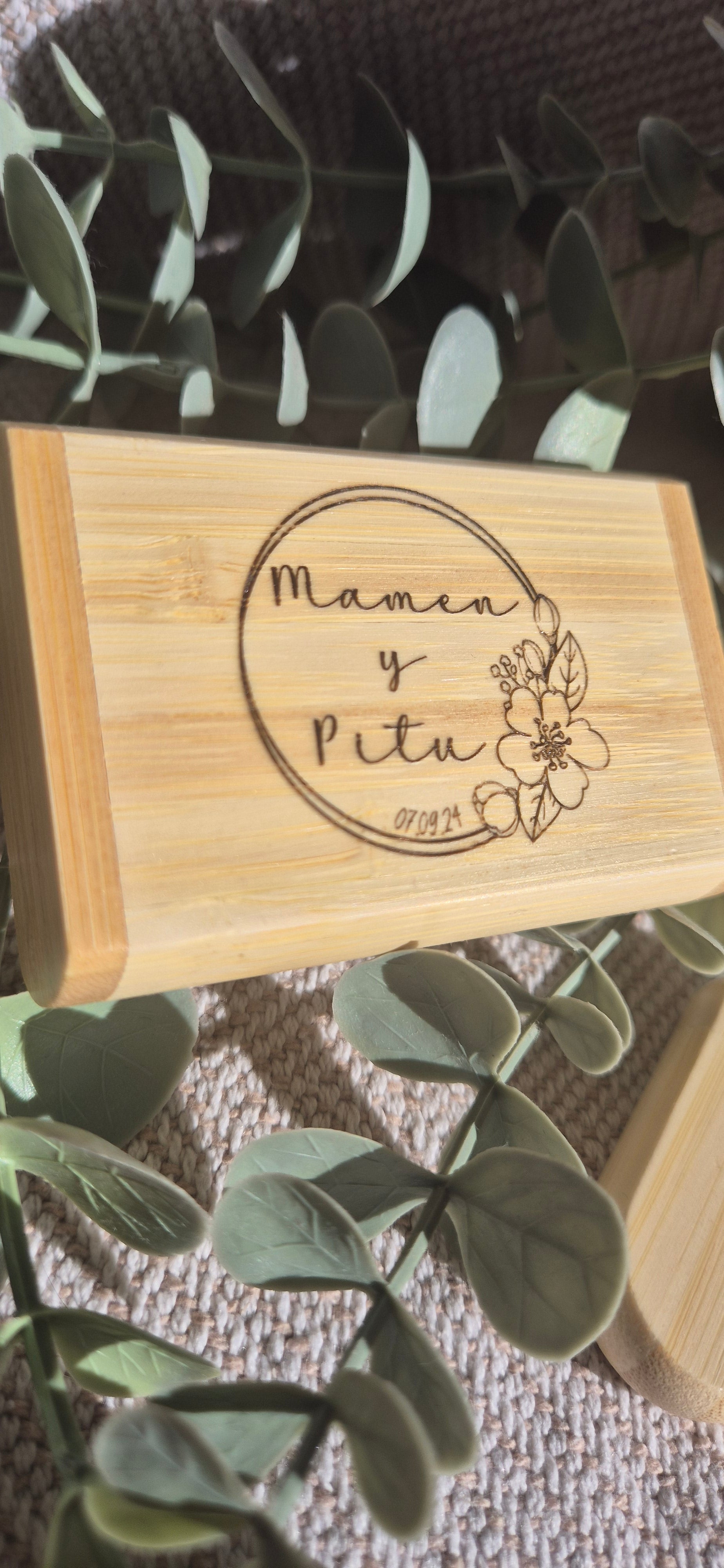 Este set incluye una memoria USB de madera con su caja a juego, tapadera de cajita con el grabado láser con nombres, iniciales, fechas, frases o logotipos. Ideal como regalo de boda, entrega de reportajes o para guardar recuerdos especiales con estilo.