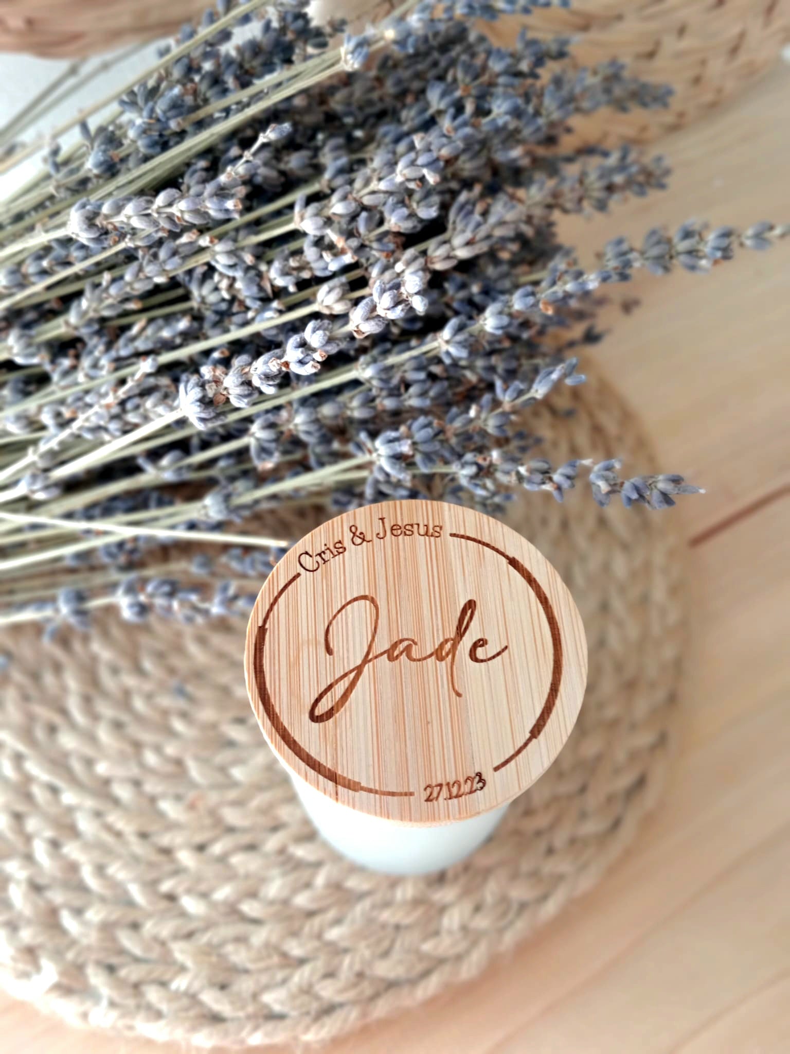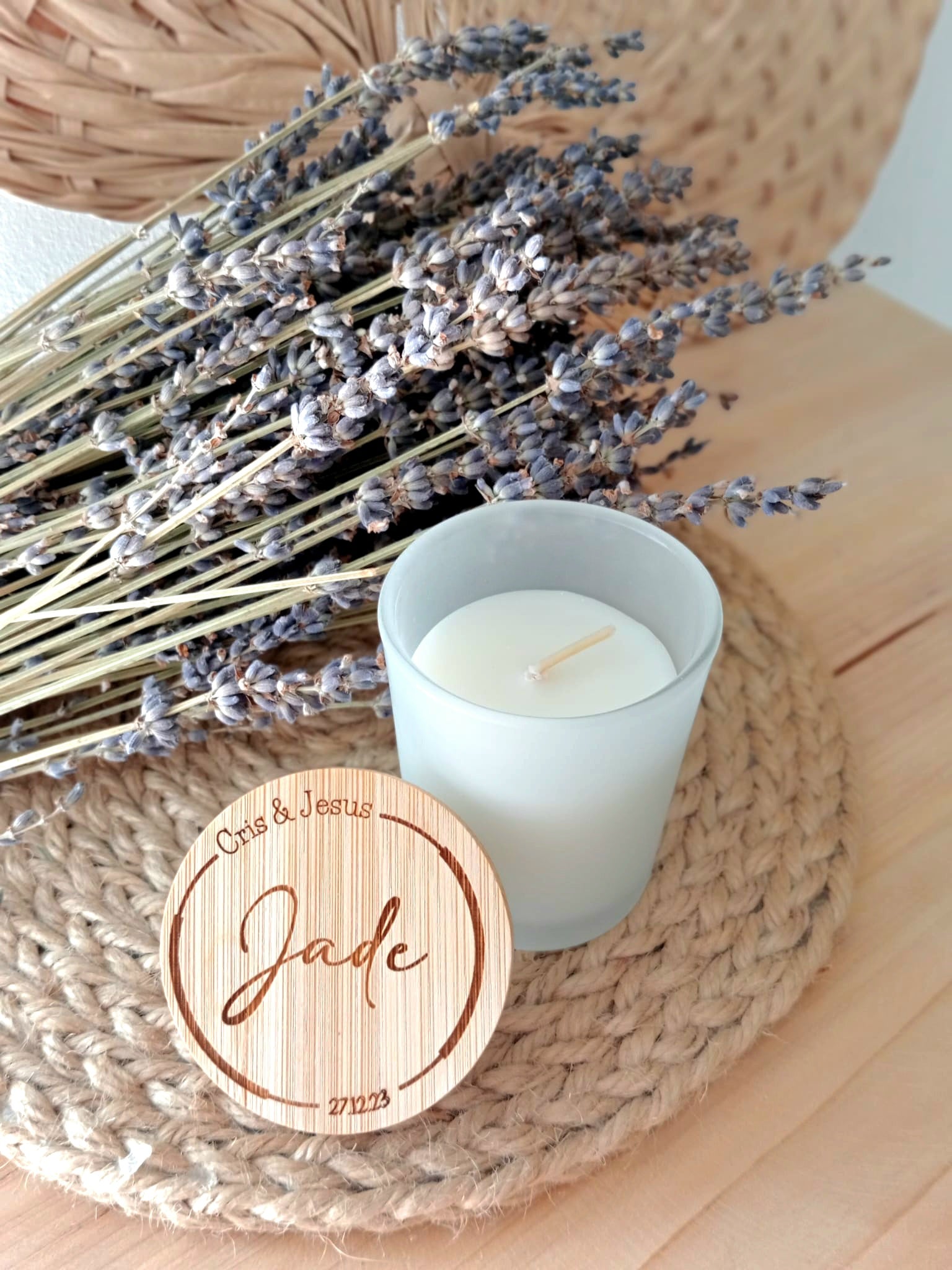 Llena tu espacio de calidez y dulzura con nuestra vela artesanal con aroma a vainilla. Presentada en un elegante bote de cristal esmerilado, esta vela incluye una tapa de madera natural grabada con láser, totalmente personalizable con nombres, fechas, frases especiales o el logo de tu marca.